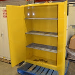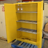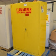 The 45 gallon Flammable Storage Cabinet allows for safe storage of hazardous materials. This flammable storage cabinet is constructed of 16 or 18-gauge steel and the sides, top, bottom, and doors are double-walled with a 1 1/2" air space between walls.