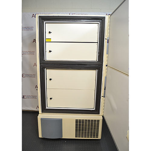 The Thermo 8270 has a storage capacity of 23.5 cu feet, and a temperature range of -50°C to -86°C. A dual door system gives users of this -80 lab freezer access to frequently used samples above, which items less needed can remain in the lower area undisturbed. It allows you to store both short, and long-term samples efficiently. It features a centralized information center, including microprocessor control and monitoring system, which ensures that all controls and displays are easy to reach and read, close to eye level.