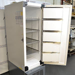 Easy-to-use ergonomic handle provides single hand operation; padlock handles for added security. Five polystyrene insulated inner doors help maintain cabinet temperature during openings and feature embedded rare earth magnets, eliminating exposed latches or magnets.