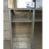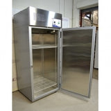 This may be the largest single door freezer we’ve seen: 34 cubic feet of storage space with stainless steel interior and exterior for durability and shiny good looks. Interior storage space dimensions are 28”D x 31”W x 60”H while the overall exterior dimensions are 32”D x 35”W x 78.5”H. The unit is configured for 115V, 60Hz electrical and uses approximately 8.8 kwh/day, depending on temperature settings and ambient temperature. The insulation is made of polyurethane foam. Automatic defrost cycle.