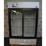 The refrigerator interior dimensions are 61.75 inches high by 48.63 inches wide by 27 inches deep with an interior volume of 45 cubic feet. The entire cabinet is mounted on casters. Two sliding doors provide easy access and glass fronts allow easy viewing of the refrigerator contents without disturbing the internal temperature.