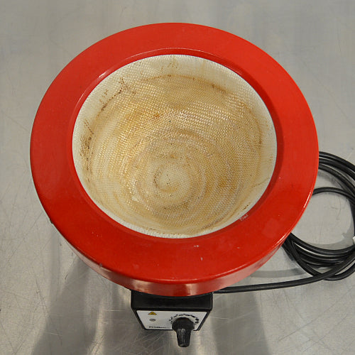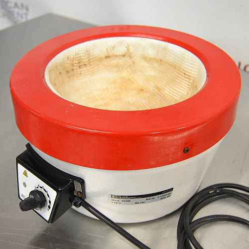 The 2-liter Fisatom 202E Heating Mantle is comprised of an aluminum body, epoxy finish, easy-to-replace heating equipment in fiberglass, and chrome-plated nickel resistance. It’s used for round-bottom flasks at a maximum temperature of 300°C. The 202E includes an electronic power regulator at 115V that acts by impulse with adjustable time visible through the pilot light.