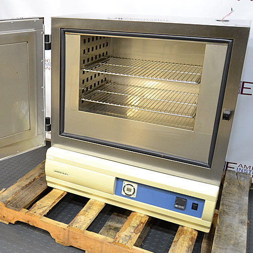 With a microprocessor-based digital temperature control system, this oven automatically adjusts parameters for precise temperature regulation. It has a 5.3 cubic foot stainless steel chamber and can reach temperatures up to 300°C. For added safety, the oven includes overtemperature control, a safety reset, and high-limit protection to ensure sample safety.