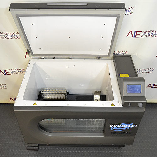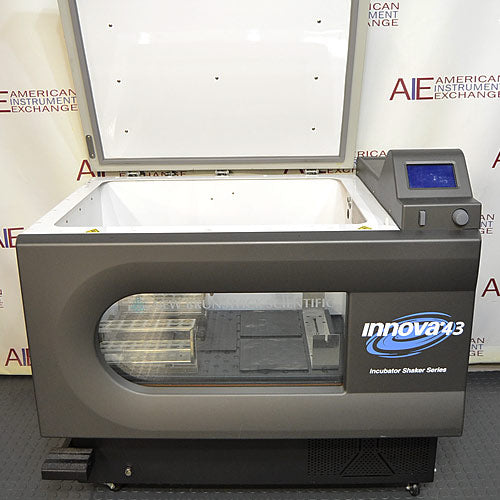 The Innova 43 features: Console style shaker/incubator with triple-eccentric drive – provides large capacity shaking for flasks up to 6 L; continuous mode or multiple-step programming; programmable Innova controls – automatically changes temperature and speed at timed intervals (store up to 4 individual programs with 15 steps each); top mounted controls and display – for easy, ergonomic viewing and setting; foot pedal release with easy to open lid – provides hands-free door opening/closing operation and effortless access to samples; and a built in spill pan which catches accidental spills to aid cleaning and protects drive mechanism, and allows for use as a water reservoir to reduce sample evaporation.
