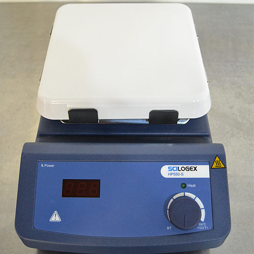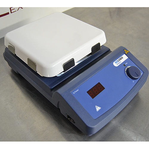 The SCILOGEX SCI550-S features an LED display for precise monitoring of temperature; a connected temperature sensor with accuracy at ±0.2°C; and a “HOT” warning flashes when the plate temperature is above 50°C.