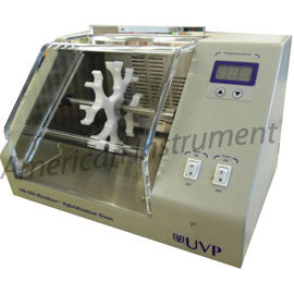 The HB-500 Minidizer Hybridization Oven is a personal desktop hybridization oven with a capacity of four 35x150mm bottles, eight 50ml or 15ml conical plastic tubes. The UVP HB-500 Minidizer features a state-of-the-art microprocessor as well as temperature and variable speed controls. The HB-500 Minidizer enables consistent saturation of samples for washing or hybridizing. The bottle carousel rotates at a uniform speed of 12 RPM. A touch-sensitive keypad and microprocessor provide accurate temperature control from ambient +10°C to 78°C. Once the desired hybridization temperature is entered the readout displays the current temperature inside the chamber. The uniformity of the chamber at 68°C is ±0.1°C; at 55°C is ±0.1°C; and at 42°C is ±0.1°C.